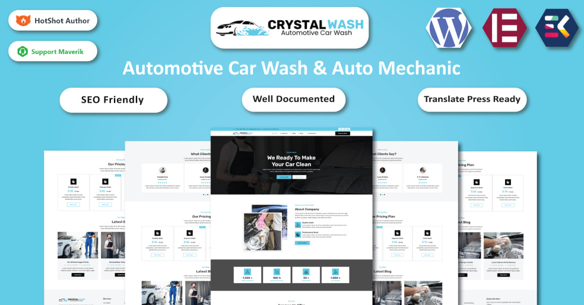 Crystal Wash – Biltvätt och bilmekaniker WordPress Elementor-mall