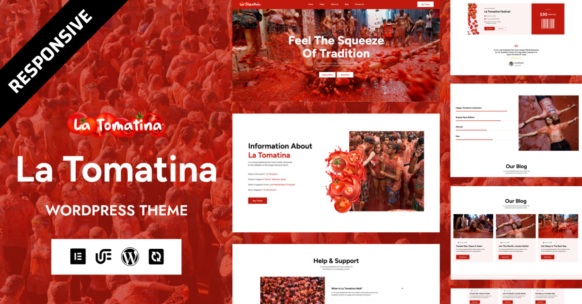 La Tomatina – WordPress Elementor-tema för festivaler, evenemang och firanden