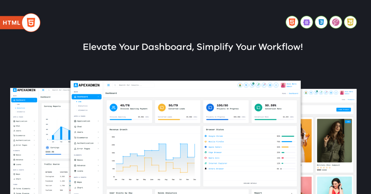 HTML, SCSS, CSS, JS ve jQuery ile sıfırdan başlamanın zorluğuna elveda deyin. ApexAdmin, göz alıcı panoları zahmetsizce özelleştirmenizi ve başlatmanızı sağlayarak sıkıcı geliştirme çalışmalarını ortadan kaldırır. Bu güçlü yönetici şablonuyla, şık ve profesyonel bir arayüz oluşturmak hiç bu kadar hızlı veya verimli olmamıştı.