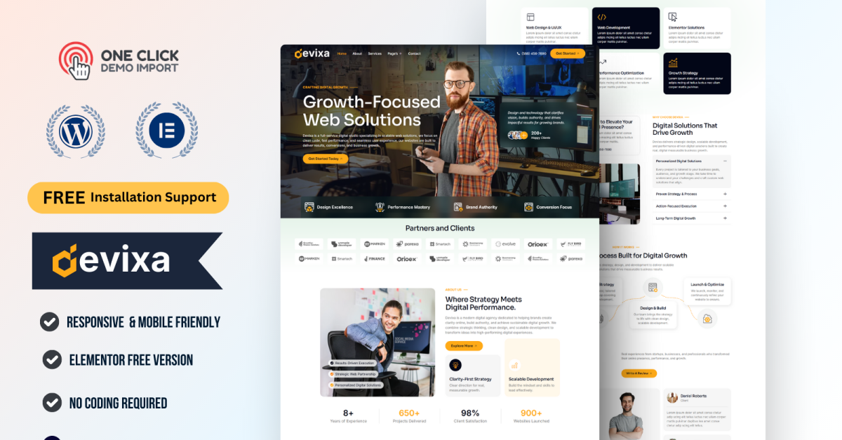 Devixa – Pazarlama Ajansı WordPress Elementor Şablon Kiti | SEO, Markalaşma ve Reklam Web Sitesi