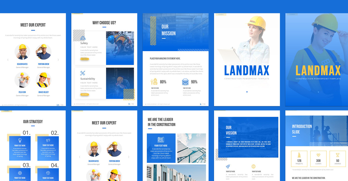Landmax – Portre İnşaat Şablonu, mimarinizi veya inşaat işinizi sunmak için en iyi seçimdir. Mavi ve sarının güçlü birlikteliği ile sunumunuzu zenginleştirmek için öne çıkıyor. Bina ilerlemesini, bina planı projelerini ve hatta mevcut mimari planı sunmak için mükemmeldir.