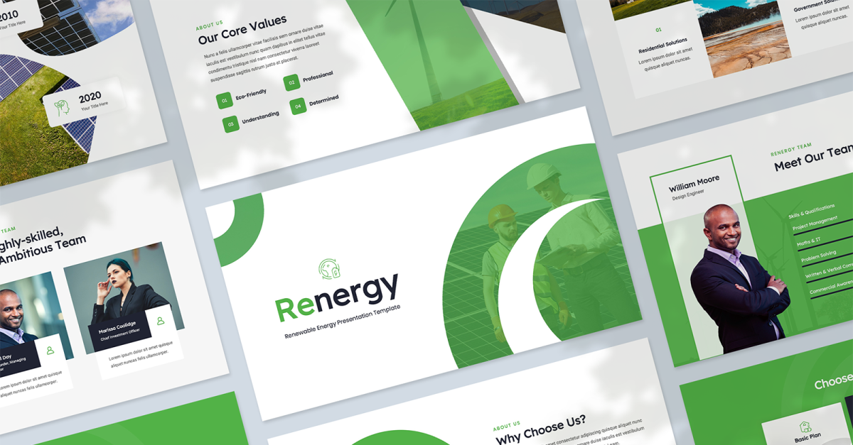 Renergy Sunum Şablonunu oluştururken, birincil odak noktamız yenilenebilir enerji sektöründe çalışan şirketler ve bireylerdi. Şirket, güneş enerjisi (güneş panelleri kurmak), rüzgar enerjisi (rüzgar türbinleri kurmak), hidro enerji (sudan enerji üretmek) ve diğer birçok seçenekte uzmanlaşabilir. Renergy, yenilenebilir enerji işinizi sergilemek için mükemmeldir. İster önemli bir yeni müşteriye ister bir iş portföyüne teklif veriyor olun, bu Google Slaytlar şablonu, bilgi ve verilerinizi hızlı ve verimli bir şekilde bir sunuma dönüştürmenize olanak tanır.