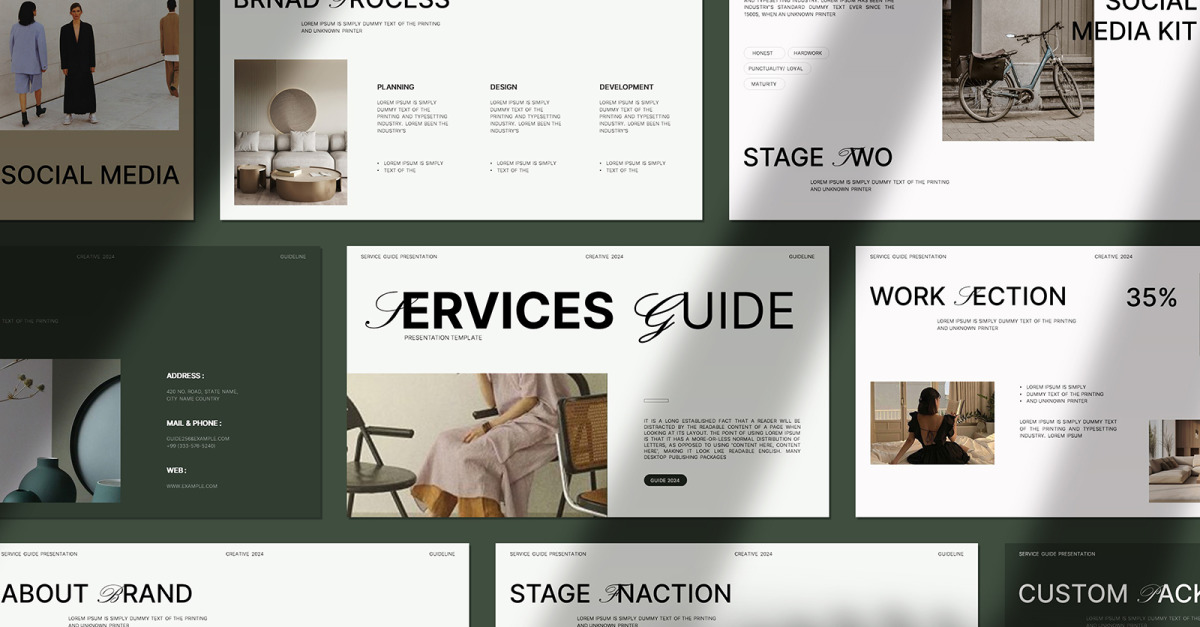 Servis Kılavuzu Sunum Şablonu, en sevdiğim markalardan biri olan Aesop'tan ilham alan klasik, zamansız ve temiz bir tasarımdır.