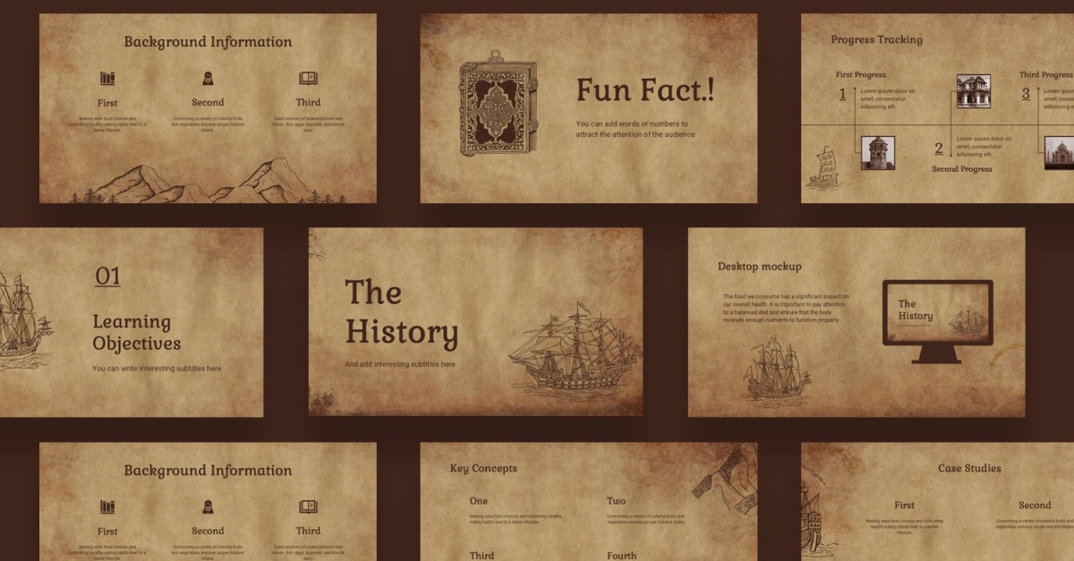 Tarih Google Slaytları'nı Tanıtın Tarih Dersi Sunum Şablonu, klasik bir tarihi ambiyansı çağrıştıran eski kağıt unsurlarını, antik gemilerin dekoratif çizimleriyle kusursuz bir şekilde harmanlayarak tarihi keşifler için mükemmel bir ortam yaratır. Özellikle eğitim ve tarih seminerleri alanları için tasarlanan bu şablon, eğitimde tarihin önemini iletmek için zarif ve bilgilendirici bir platform sunar. Büyüleyici görselleri ve ilham verici ambiyansıyla bu sunum, tarihi konuların coşkulu ve net bir şekilde iletilmesini kolaylaştırır.