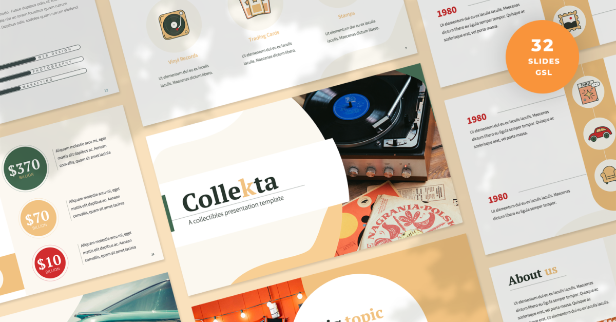 Google Slaytlar için Collekta Sunum Şablonu, koleksiyonluk konusunu ihtiyacınız olan herkese sunmanıza olanak tanıyan modern ve dinamik bir sunumdur. Tüm ihtiyaçlarınıza uyacak şekilde kolayca düzenlenebilen ve ayarlanabilen 34 güzel tasarlanmış slayt içerir.
