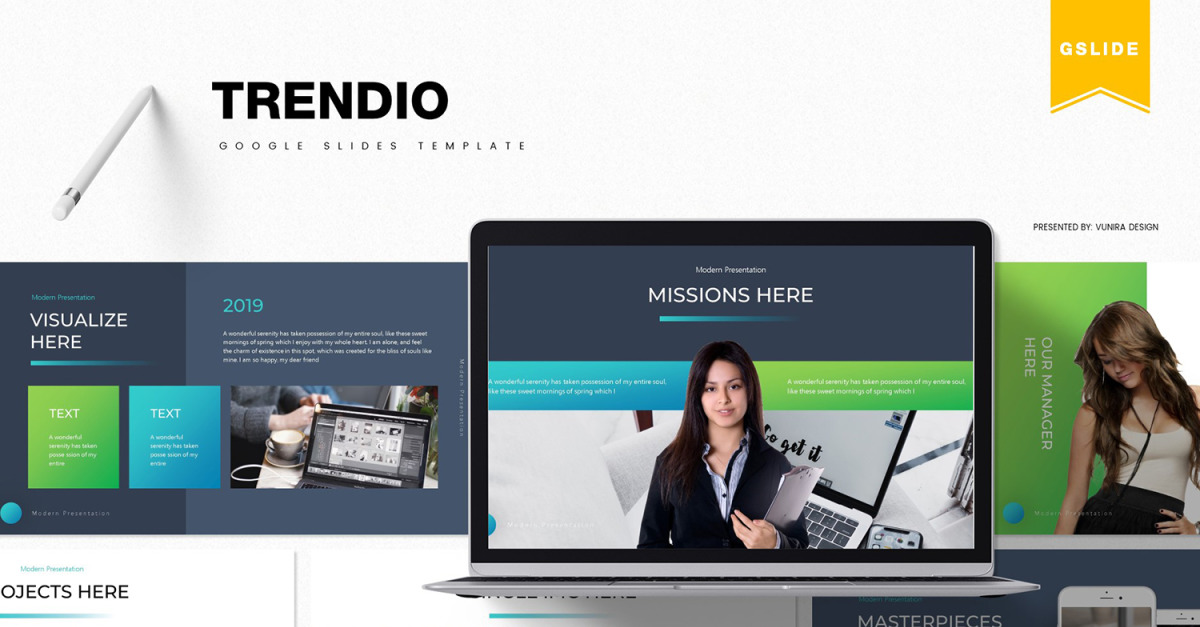 Bu **Trendio | Google Slaytlar Şablonu**- Hemen edinin!, Tüm ticari veya kişisel ihtiyaçlar için harika bir Google Slaytlar şablonu.