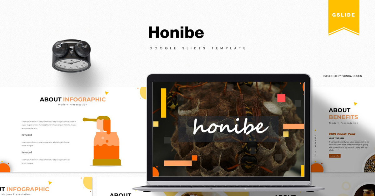 Bu **Honibe | Google Slaytlar Şablonu**- Hemen edinin!, Tüm ticari veya kişisel ihtiyaçlar için harika bir Google Slaytlar şablonu.