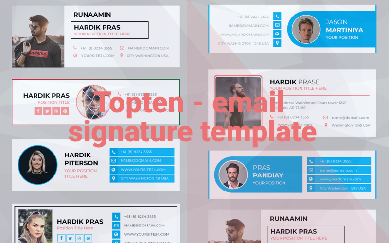 On adet PSD E-posta E-imza şablonu. E-postalarınıza yepyeni bir görünüm kazandırın! İşiniz veya kişisel kullanımınız için modern ve profesyonel bir e-posta imza seti ile tanışın.