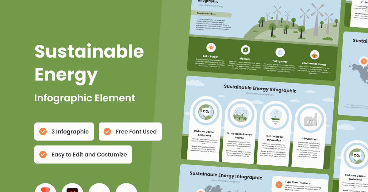 Sürdürülebilir Enerji İnfografik Şablonu V1 ile yeşil enerjinin geleceğini aydınlatın. İlgi çekici ve bilgilendirici şekilde tasarlanan bu şablon, yenilenebilir enerji kaynakları, enerji verimliliği ve sürdürülebilirlik girişimleri hakkındaki verileri sunmanın görsel olarak ilgi çekici bir yolunu sağlar. Sunumlar, raporlar ve eğitim materyalleri için mükemmeldir.