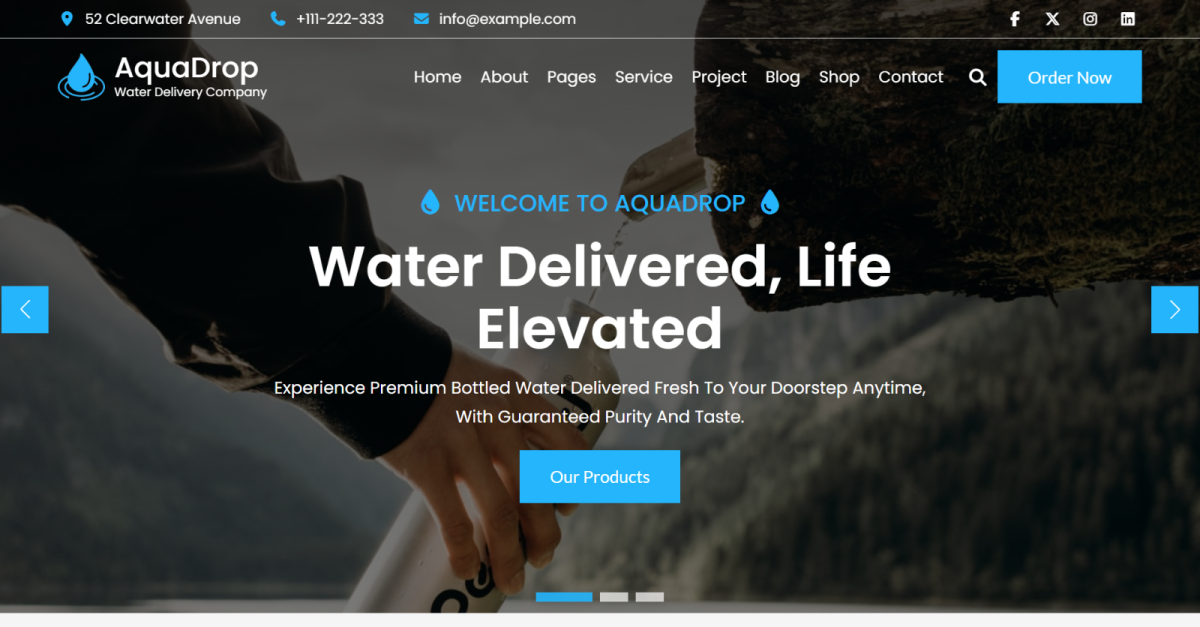 Aquadrop – Su Dağıtım Şirketi HTML5 Web Sitesi Şablonu, su tedarikçileri, ev ve ofis dağıtım hizmetleri, şişelenmiş su markaları, filtreleme işletmeleri ve hidrasyon çözümü sağlayıcıları için tasarlanmış, temiz, ferahlatıcı ve hizmet odaklı bir tasarımdır. Net ve güvenilir bir çevrimiçi varlık oluşturarak güven inşa etmeyi amaçlayan bu şablon, HTML5, CSS3 ve JavaScript kullanılarak geliştirilmiştir ve tüm ekran boyutları için optimize edilmiş , akıcı, modern ve tamamen duyarlı bir düzene sahiptir. Aquadrop, dağıtım markalarının hizmetlerini net ürün öne çıkanları, sadeleştirilmiş rezervasyon bölümleri, hizmet odaklı görseller ve müşteri merkezli sunum ile sergilemelerine yardımcı olarak, güvenilir, verimli ve profesyonelce hazırlanmış bir dijital deneyim yaratır.