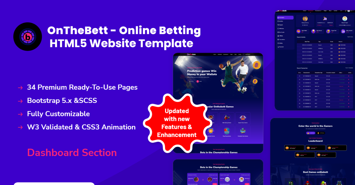 OnTheBett teması, Çevrimiçi Bahis, Çevrimiçi Casino Oyunları ve Spor Oyunları ile ilgili web sitesi şablonları yayınladı, artık herkes çevrimiçi kumar veya bahis işletmeleri için kolayca bir web sitesi yapabilir. Şablon, maksimum kullanıcı için çekici hale getirmek ve arama motoru performansında daha iyi sonuçlar göstermek için mobil uyumluluk ve hatasız kod ile tasarlanmayı amaçlamaktadır. Bu web sitesi şablonu, çeşitli çevrimiçi oyunlar yayınlamak için seçenekler sunar. On The Bet web sitesi şablonundaki gösterge paneli bölümü, kullanıcıların verilerini barındırmak için ayrı olarak düzenlenmiştir. Bu web sitesi şablonu, kolay, profesyonel görünümlü bir çevrimiçi bahis işletmesi web sitesi oluşturmayı amaçlamaktadır. İyi bir profesyonel kumar web sitesinin bir sonucu olarak, Bett web sitesi şablonuna birçok sayfa ekledik. Bu Şablon, kumarhane oyunları ve kriket bahisleri gibi çevrimiçi oyunlara adanmıştır. Onthebett şablonu, Bootstrap'in en son sürümüyle oluşturulmuştur. Video ve afiş ana sayfaları buna dahil edilmiştir.