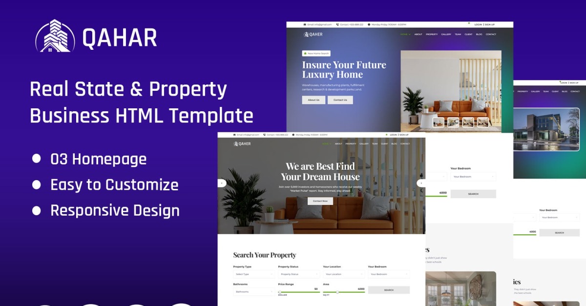Qaher, Modern bir Emlak Teması ve Duyarlı Temiz Tasarım sunan Benzersiz bir sayfadır. Bu şablon, Emlak, emlak listesi, Emlak acentesi, Kendi mülk web sitesi ve Emlak ve emlak hizmetleriyle ilgili diğer tüm işletmeler için son derece uygundur.