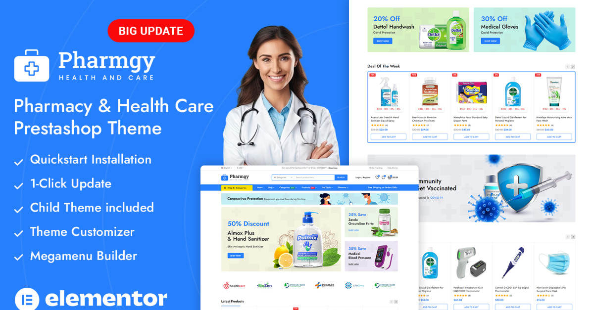 Pharmgy – Medicine Store PrestaShop Duyarlı Tema, çevrimiçi eczaneler, tıbbi ekipman tedarikçileri, ilaç mağazaları, sağlıklı yaşam mağazaları ve sağlıkla ilgili e-ticaret işletmeleri için oluşturulmuş temiz, profesyonel ve son derece kullanıcı dostu bir temadır. Sakin renk stili, net ürün sunumu ve kolay navigasyonu, müşterilerin temel sağlık ürünlerini hızlı bir şekilde bulmalarını sağlarken güven oluşturmaya yardımcı olur.