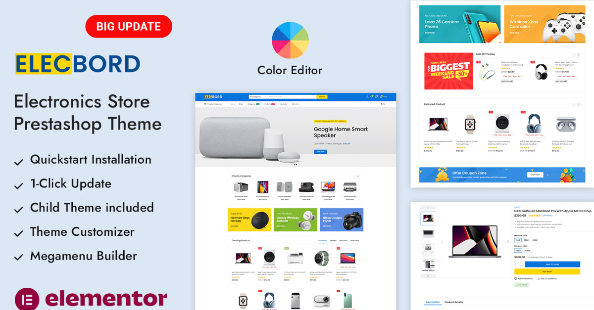 Tema, hızlı bir şekilde mağazanızı demo içerikle başlatmanızı sağlayan bir Hızlı Başlangıç kurulum paketi içerir. Tamamen duyarlı tasarımı , SEO dostu yapısı ve çoklu dil ve çoklu para birimi desteğiyle Elecbord, hem yerel hem de küresel teknoloji işletmeleri için mükemmel bir şekilde uygundur.