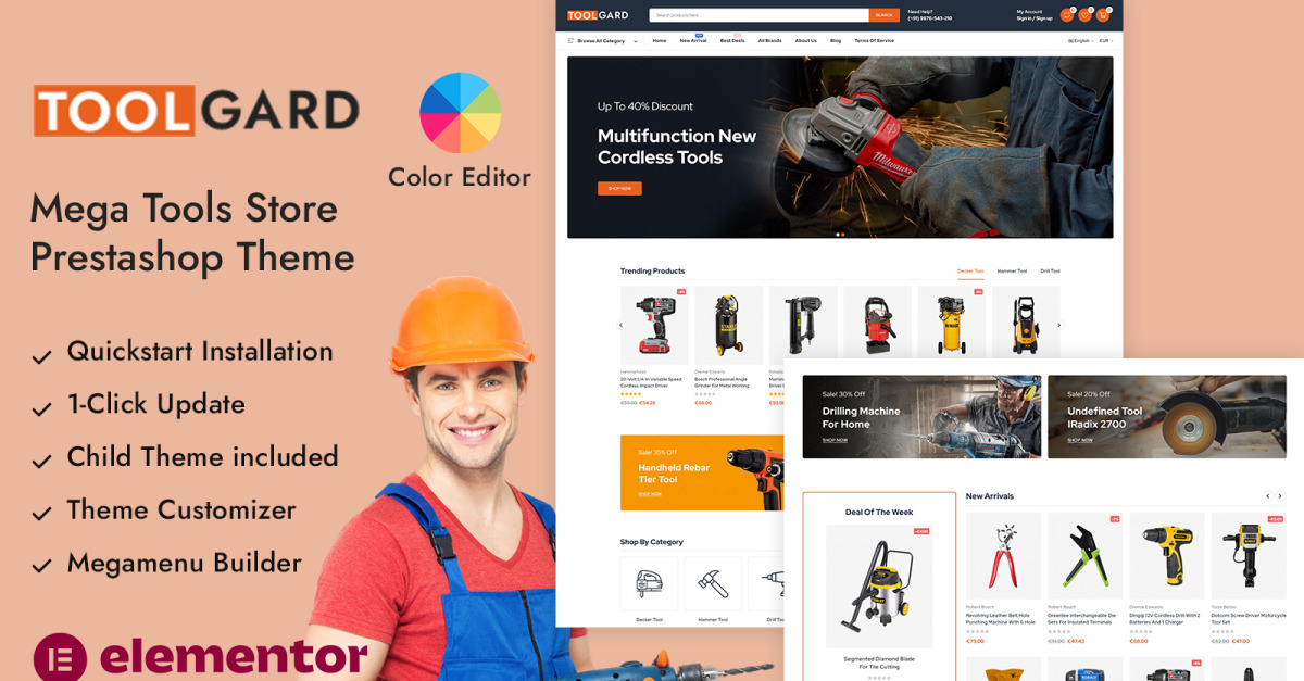 Toolgard Mega Tools Store, Prestashop'un en son sürümüyle oluşturulmuş harika bir Prestashop temasıdır. Bu tema, Araçlar, Otomobil Parçaları, Makine Aksesuarları, Endüstriyel Aletler, Elektronik Ürünler ve daha birçok ürün için mükemmel bir şekilde tasarlanmıştır.