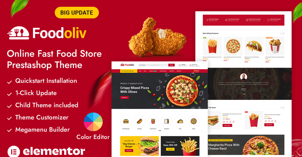 Foodoliv , hızlı yemek restoranları, paket servis işletmeleri, kafeler, bulut mutfaklar, yemek dağıtım hizmetleri ve sokak yemekleri markaları için tasarlanmış, canlı, modern ve iştah açıcı bir PrestaShop duyarlı temasıdır . Cesur renkleri, enerjik düzeni ve iştah açıcı ürün sunumuyla Foodoliv, hamburgerleri, pizzaları, sandviçleri, atıştırmalıkları, menüleri ve içecekleri, aç müşterileri anında cezbeden ilgi çekici bir şekilde sergilemenize yardımcı olur.