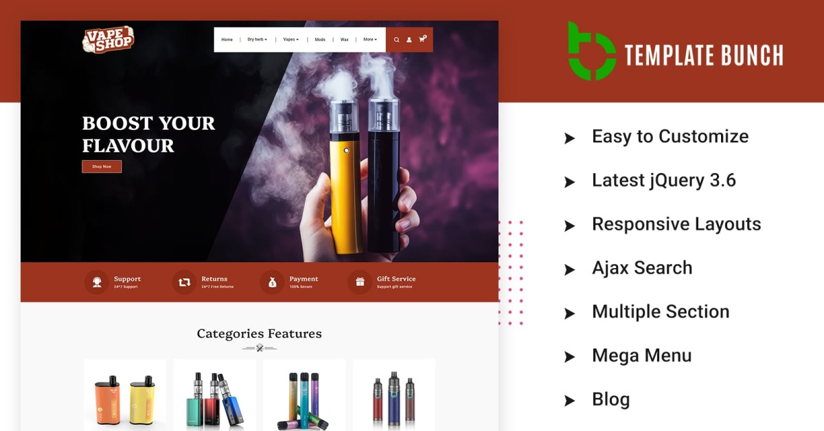 Vape Shop - Duyarlı PrestaShop eTicaret Teması, özellikle çevrimiçi vape mağazaları, e-sigara perakendecileri ve duman aksesuarı mağazaları için tasarlanmış cesur ve modern bir çözümdür. Sağlam Bootstrap çerçevesi üzerine inşa edilmiş ve PrestaShop 8.1.1 ile tamamen uyumlu olan bu tema, kusursuz ve profesyonel bir vitrin deneyimi sunar. Temiz, minimal düzeni, Icofont simgeleri ve ücretsiz Google Fontları ile geliştirilmiştir ve sitenize tüm modern tarayıcılarda ve cihazlarda çalışan şık ancak kullanıcı dostu bir görünüm kazandırır.