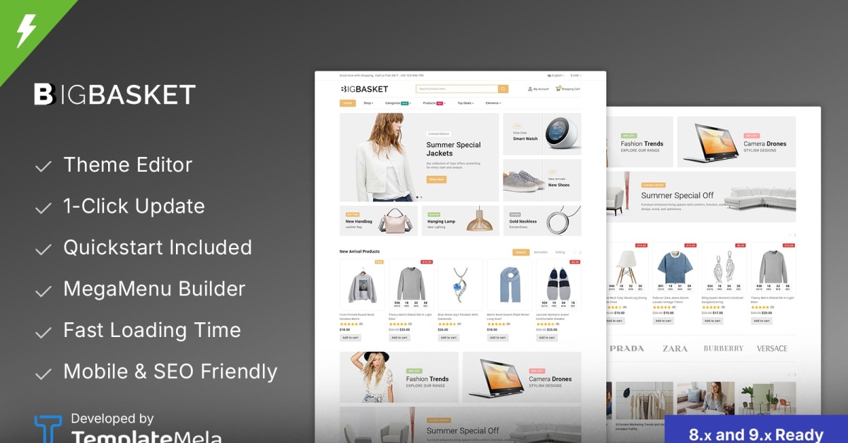 BigBasket, moda butikleri, kuyumcular ve yaşam tarzı markaları için tasarlanmış modern, zarif ve özellik açısından zengin bir PrestaShop duyarlı temasıdır . Temiz düzeni, şık tipografisi ve dengeli ürün bölümleriyle BigBasket, giyim, aksesuar ve mücevherlerinizi görsel olarak çekici ve profesyonel bir çevrimiçi mağazada sergilemenize yardımcı olur.