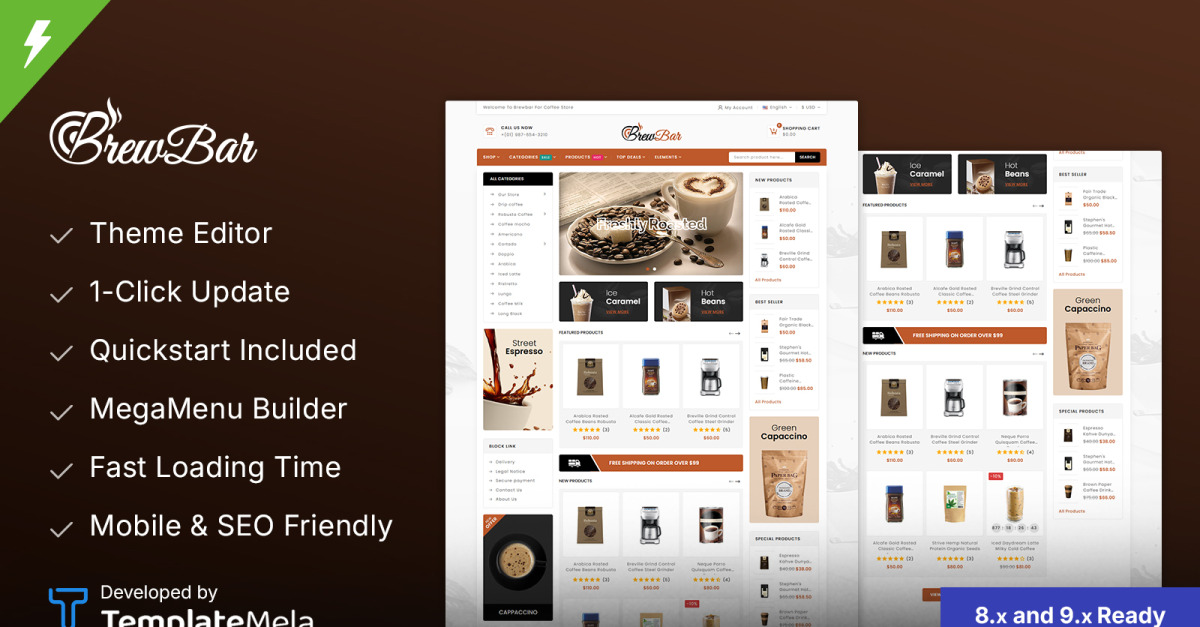 SEO , hız ve en yeni PrestaShop standartları için optimize edilmiş olan BrewBar, güvenilir performans ve ölçeklenebilirlik sunar. İster kahve çekirdekleri, ister demlenmiş içecekler, kafe atıştırmalıkları veya hediye sepetleri satıyor olun, BrewBar çevrimiçi kahve işletmenizi büyütmek için stil, esneklik ve modern e-ticaret işlevselliğinin mükemmel bir karışımını sağlar.