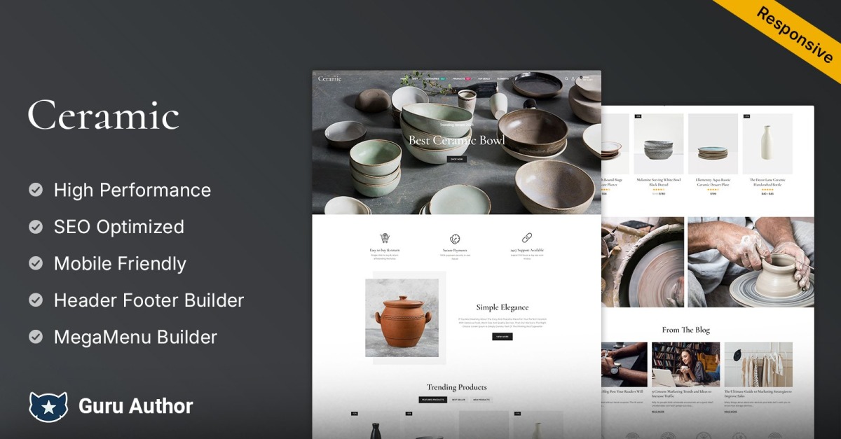 Seramik, zanaatkârların el sanatlarının güzelliğini ve karmaşıklığını vurgulayan büyüleyici bir tasarıma sahiptir. Temiz çizgiler, modern tipografi ve ince vurgularla her öğe, ürünlerinizin görsel çekiciliğini artırmak ve müşterileriniz için unutulmaz bir gezinme deneyimi yaratmak için titizlikle seçilmiştir.