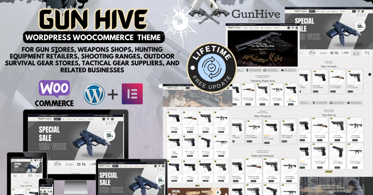 Gun Hive ile silah dükkanınızın veya silah mağazanızın ihtiyaçlarına göre uyarlanmış profesyonel, güvenli ve görsel olarak çekici bir web sitesi oluşturabilirsiniz. Bu güçlü WordPress WooCommerce Elementor temasıyla bugün çevrimiçi varlığınızı oluşturmaya başlayın!
