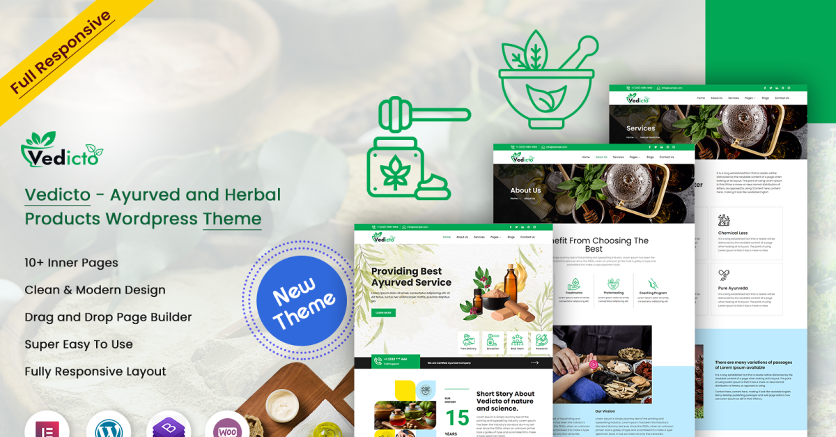 Vedicto Ayurved & Bitkisel Ürünler için WordPress teması. Bu şablon temiz, çağdaş ve profesyonel görünüyor. Ayurveda Tedavisi ve Bitkisel Ürünler için güzel web siteleri, Ayurveda yardımı, teta şifası, yoga, doğal spa, danışma, koçluk ve diğer ilgili etkinlikleri sorunsuz bir şekilde birleştirir.