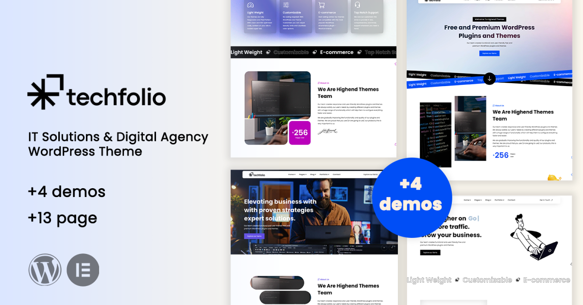 Elementor destekli Techfolio, tek bir satır kod yazmadan etkileyici bir kullanıcı deneyimi tasarlamanıza olanak tanır. Tema, markanızın vizyonuyla uyumlu olacak şekilde kolayca özelleştirilebilen ana sayfalar, hizmetler ve blog yazıları için kapsamlı bir önceden oluşturulmuş düzen paketiyle birlikte gelir.