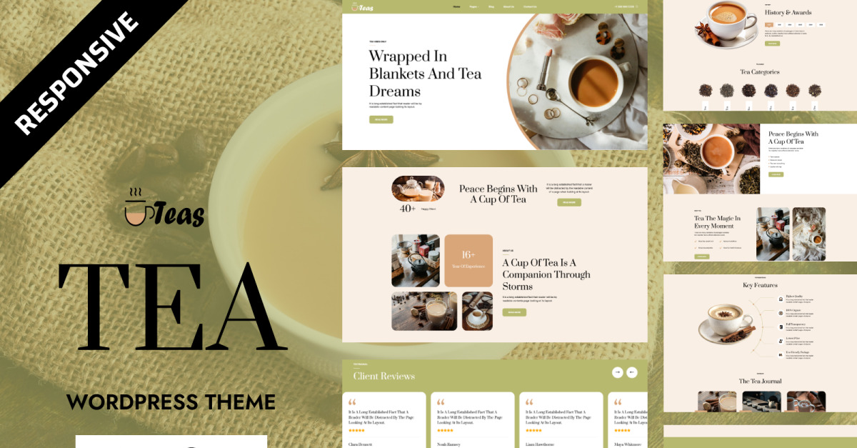 Teas Tea WordPress Şablonu, organik çay dükkanları, bitkisel ürün markaları, çay plantasyonları, sağlıklı yaşam kafeleri, Ayurveda satıcıları ve içecek işletmeleri için özel olarak tasarlanmış, doğadan ilham alan, güzel bir tasarıma sahip bir şablondur.