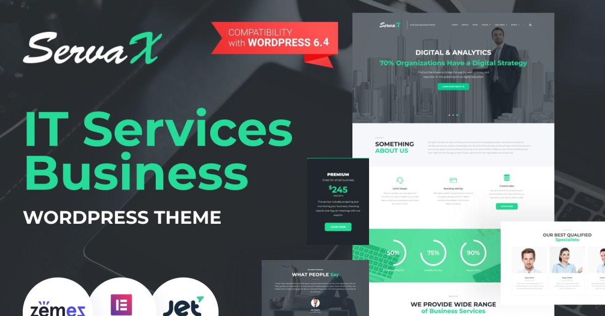 ServaX – BT hizmetleri WordPress şablonu, yüksek kaliteli, çok fonksiyonlu bir web sitesine ihtiyaç duyan BT şirketleri ve dijital hizmet sağlayıcıları için tasarlanmış profesyonel bir çözümdür. Farklı pazaryerlerinde BT alanı için birçok şablon bulunmaktadır. Ancak Zemez ekibi size benzersiz bir yenilik sunuyor! Ve bu da ServaX - BT WordPress şablonudur.