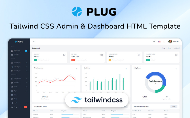 Плагін – Tailwind CSS Admin & Dashboard Template виступає як універсальний набір інтерфейсу користувача для адміністратора та Webapp, що використовує першу утиліту CSS-платформу TailwindCSS v3. Наповнений набором повторно використовуваних елементів, компонентів, макетів, форм, інформаційних панелей, він служить надійним набором інструментів для різноманітних проектів. Завдяки потужності, адаптивності та надзвичайно швидкому відгуку Plug дає змогу створювати сучасні веб-додатки. Незалежно від того, чи створюєте ви інтерфейси SaaS, панелі адміністратора, інформаційні панелі, CRM, CMS, LMS, платформи електронної комерції тощо, Plug пропонує сучасне рішення для різноманітних цифрових підприємств.