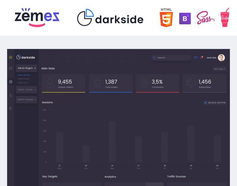 Цей шаблон адміністратора інформаційної панелі представляє вам добре продуманий і стильний дизайн, виконаний у темних тонах. Це привертає увагу і приносить задоволення. Шаблон також пропонує професійно створену структуру. Таким чином, легко знайти будь-які інструменти та сторінки, які вам потрібні. Darkside також містить величезну кількість крутих анімацій та ефектів.