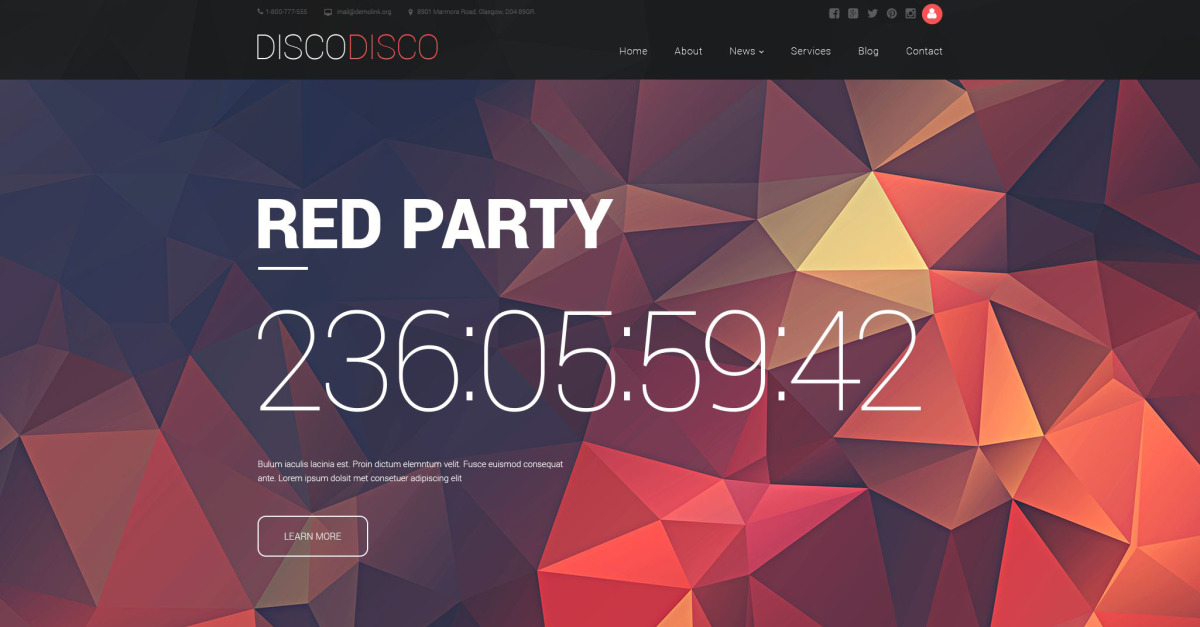 Залучіть більше відвідувачів до свого нічного клубу, зробивши вражаючу онлайн-презентацію свого розважального закладу. Поєднання кольорів шаблону нічного клубу Drupal вражає. Таймер , розміщений на фоні кольорового багатокутника, створює відчуття терміновості, стимулюючи активність відвідувачів. Фотогалерея передає клубну атмосферу та демонструє середовище. Нижче оголошено наступні події. Контактна форма та вбудована карта Google тут для обслуговування потенційних гостей клубу.