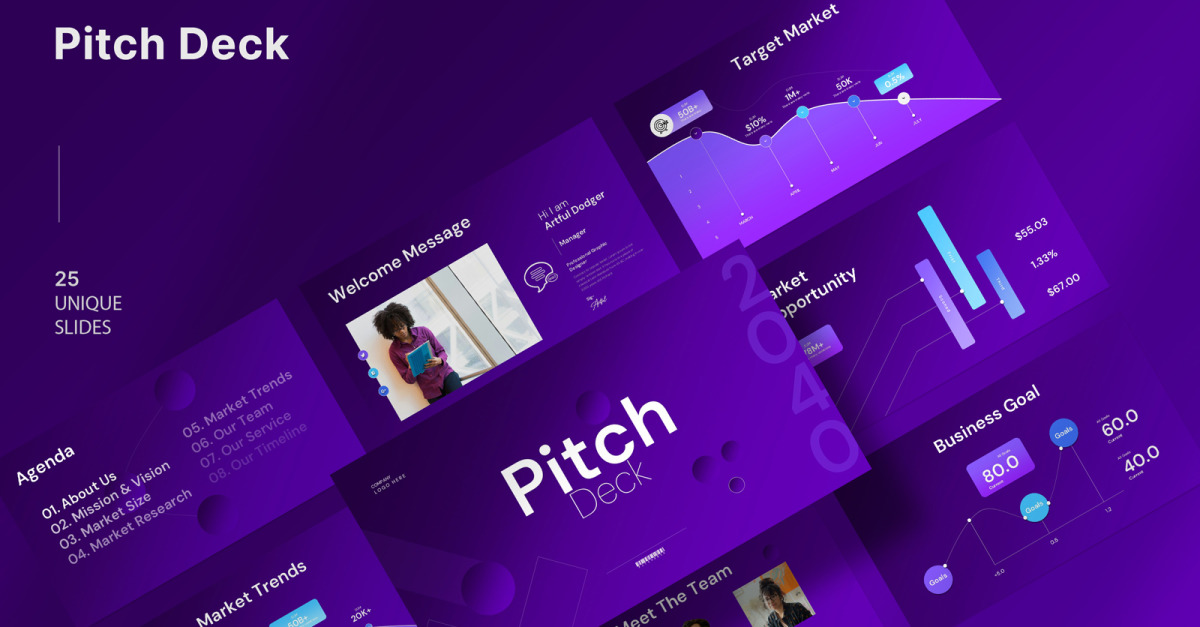 Шаблон Google Slide Business Pitch Deck дозволяє просто додати свій логотип і зображення, а також відредагувати кольори та типографіку бренду, і все готово. Не гайте часу, ми зробили всю важку роботу за вас.