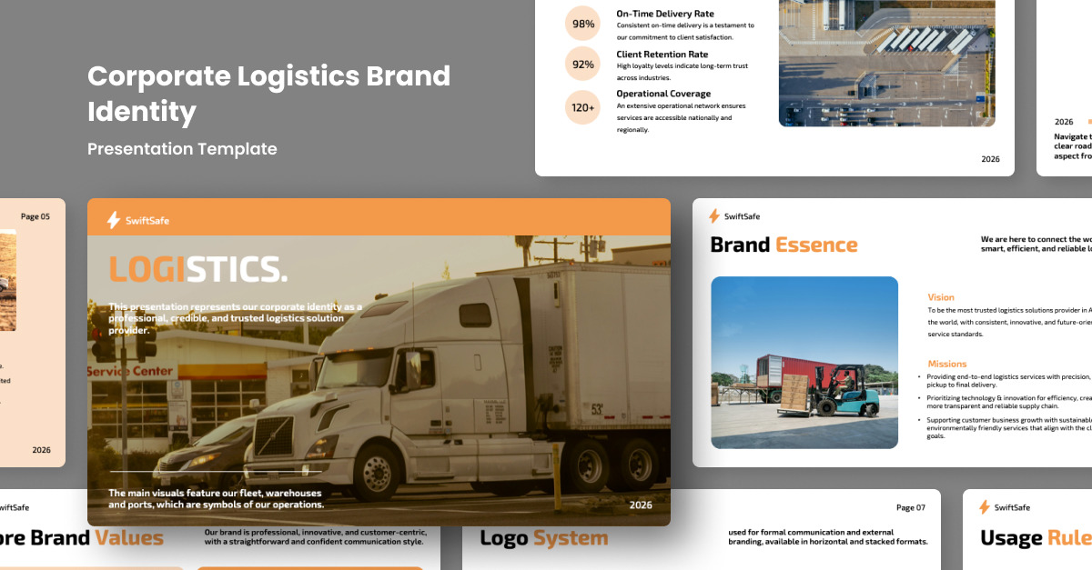 **Примітка:** Усі зображення використовуються лише для попереднього перегляду та НЕ включені до файлів завантаження. Зробіть свою презентацію з логістики особливою за допомогою цього шаблону фірмового стилю Google Slides. Завдяки лаконічному корпоративному дизайну, сучасним іконкам та галузевим візуальним елементам, він створений для професійної демонстрації транспортних послуг, рішень для ланцюгів поставок або корпоративного брендингу.