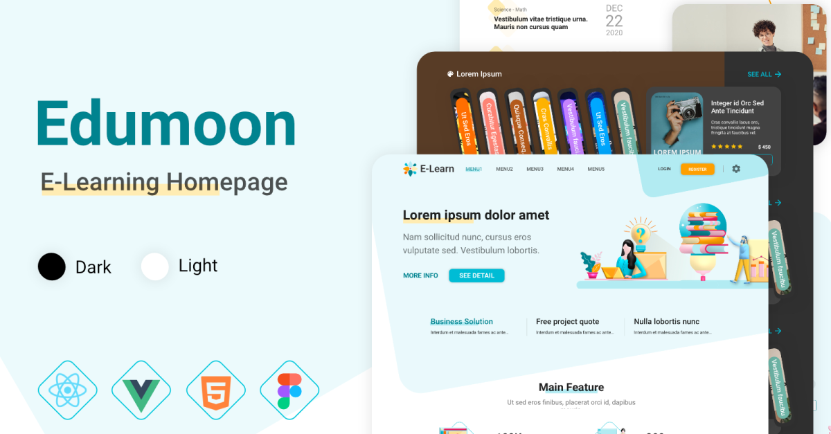 Edumoon — ідеальна цільова сторінка для освітніх, шкільних або електронних систем навчання. Цей шаблон створено за допомогою html5, react, vue.js і розроблено за допомогою figma . Це для вас, щоб представити свою платформу або оптимізувати та покращити презентації продуктів.
