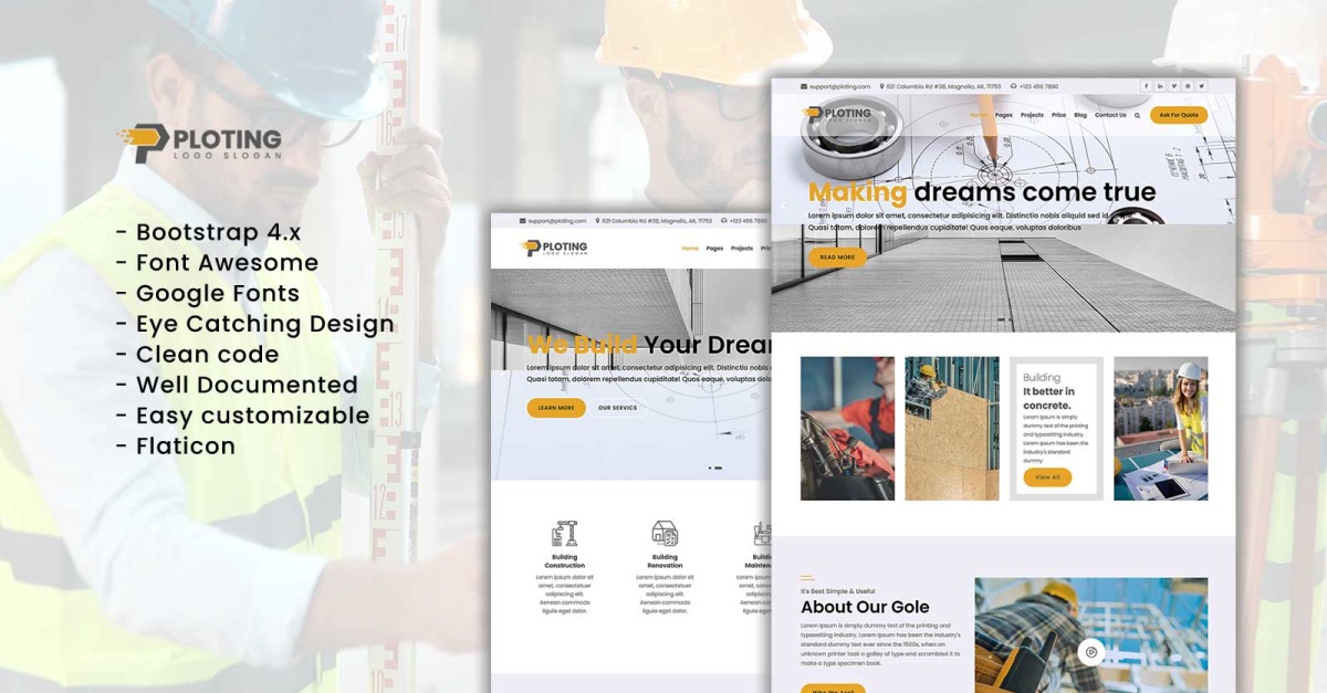 Будівництво та архітектура – дві галузі, які завжди були затребувані. Світ постійно розвивається та змінюється, і щоб не відставати від нього, потрібні нові будівлі та споруди. У сучасному світі дуже важливо мати сильну присутність в Інтернеті, і саме тут на допомогу приходить шаблон Ploting Construction & Architecture React JS.
