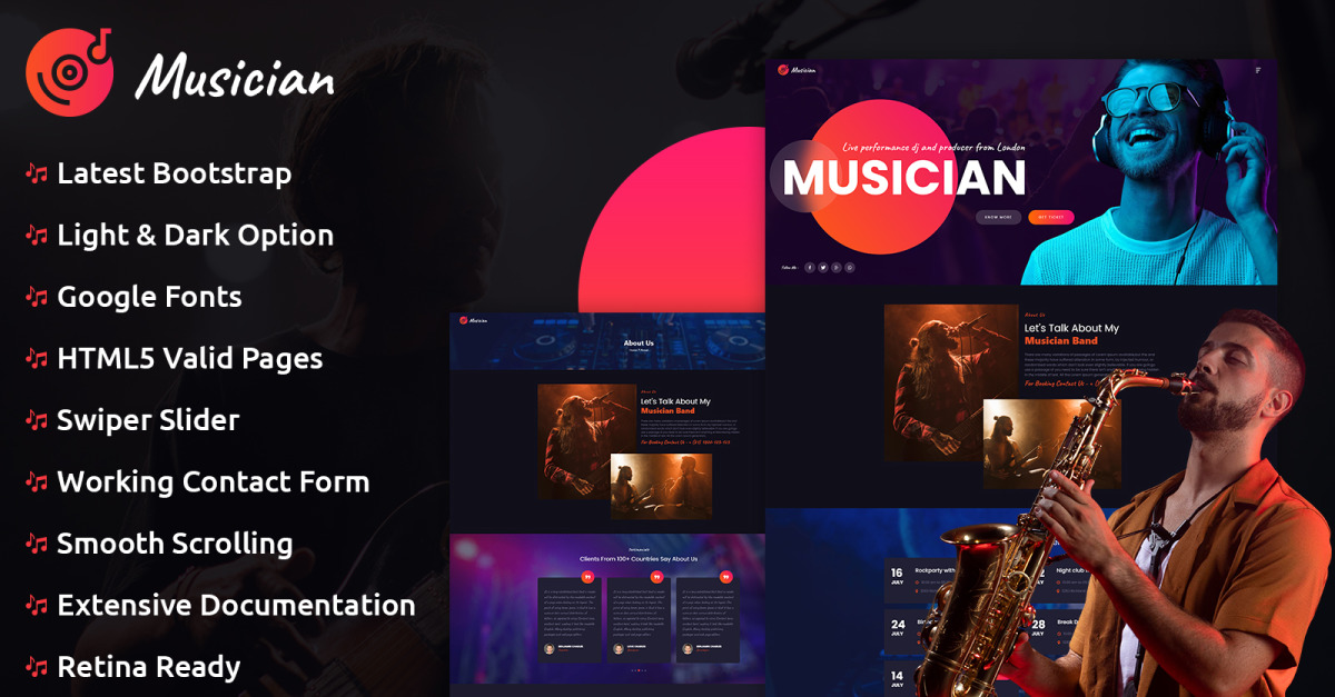 Шаблон музиканта, динамічний шаблон із параметрами світлої та темної теми, тепер існує! Вашій потужній та енергійній групі потрібен такий шаблон, як шаблон музиканта.