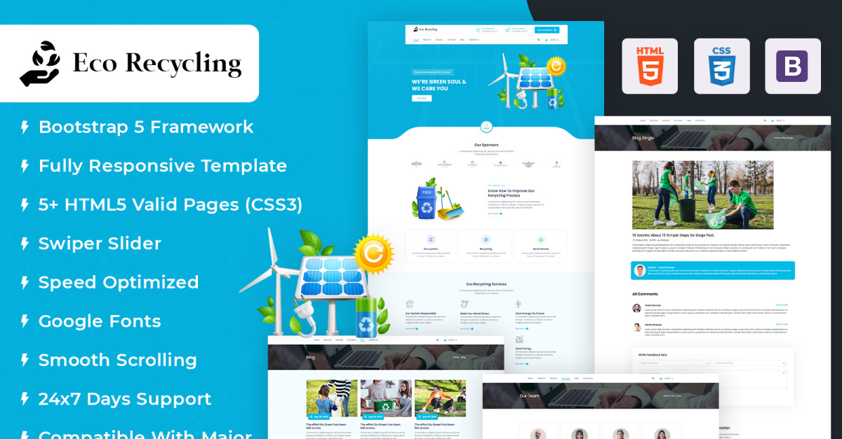 Яскрава синьо-зелена комбінація кольорів створює ідеальну екосистему, яка відповідає вашому тресту чи агентству з переробки. Сумісність із різними браузерами, Swiper Slider, оптимізація швидкості та багато інших функцій — це вибух після зламаного пакета.
