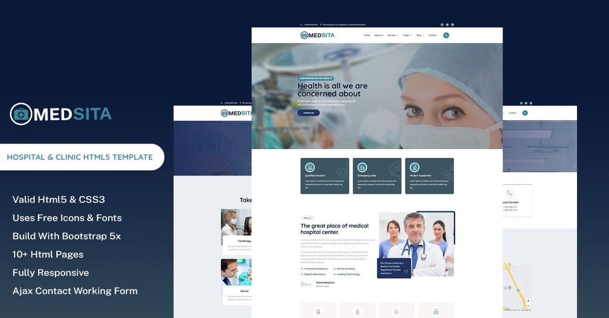 Medsita - шаблон HTML5 для лікарень та клінік , який часто призначений для лікарень та лікарів-клінік. Це повністю адаптивний шаблон, розроблений на Bootstrap 5x, HTML5, CSS3, JavaScript, jQuery. Це сучасний шаблон HTML5, який можна використовувати для веб-сайту онлайн-запису на прийом . Незалежно від того, чи ви лікар, фізіотерапевт, директор лікарні, маєте патологоанатомічну дослідницьку лабораторію чи інший спеціалізований продукт чи послугу, пов'язану з охороною здоров'я. Він дуже настроюваний – чудово виглядає на планшетах та мобільних пристроях. На нашій платформі ви знайдете спеціальні шаблони, розроблені спеціально для послуг у сфері охорони здоров'я. Ми додали папку з документацією, щоб пояснити структуру коду. Ми додали найкращий посібник з веб-розробки – ви зможете створити гарний макет веб-сайту, що підтримує Bootstrap.