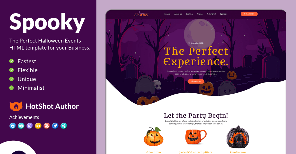 HTML-шаблон Spooky – односторінковий хеллоуїн має темний і страшний дизайн для хеллоуїнських подій, вечірок, а також надає різні функції, наприклад квитки на хеллоуїн, опис події, галерею подій, меню вечірки, блоки опису веселих ігор, спонсорів події, відгуки тощо. це привабливий дизайн верхнього та нижнього колонтитулів із контактними даними.