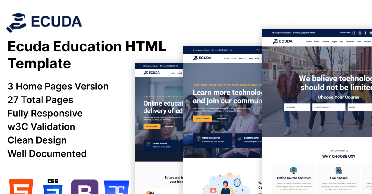 HTML-шаблон Ecuda – Education & Online Courses – це чистий і сучасний освітній шаблон HTML5 Bootstrap. Він підходить для будь-якого університету, онлайн-курсу, семінару, коледжу, школи, центру курсів або будь-якого навчального закладу. Цей шаблон містить 3 різні версії домашньої сторінки з 24+ ретельно розробленими блоками сторінок html, які легко редагувати та налаштовувати відповідно до ваших потреб. Шаблон - ідеальне рішення для створення унікальних освітніх сайтів.