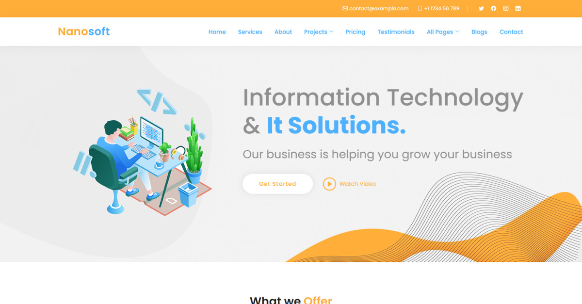 Найкращий HTML5-шаблон IT-рішень – це HTML5-шаблон веб-сайту Nanosoft - Technology and It Solution. Шаблон Nanosoft містить багато функцій і сторінок, щоб створити веб-сайт IT Solutions & Technology за кілька хвилин без навичок кодування. Шаблон Nanosoft на 100% адаптивний і підтримує всі пристрої, такі як мобільні пристрої, планшети, настільні комп’ютери та великі екрани. завантажте та насолоджуйтесь багатьма іншими функціями. Шаблон Nanosoft містить усі демонстраційні зображення з документацією та кодом, оптимізованим для SEO. Завантажте та насолоджуйтесь багатьма іншими функціями, включаючи швидку підтримку.