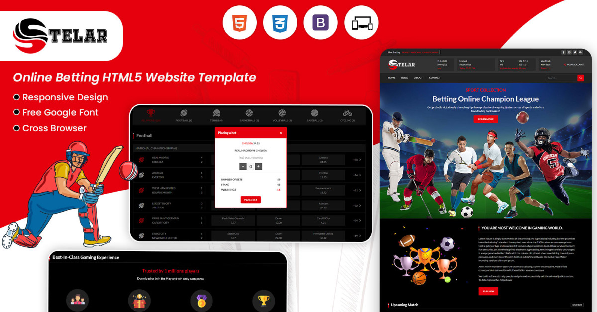 Шаблон веб-сайту Stelar – он-лайн ставок HTML5 спеціально розроблений для ставок, ігор, карт, крикету, футболу, тенісу, баскетболу, волейболу, бейсболу, велоспорту, бадмінтону, спорту, джекпоту, казино, чуйного, бізнесу, інвестицій. Шаблон підходить для всіх типів пристроїв (настільного комп’ютера, ноутбука, планшета, мобільного телефону) і повністю реагує з кросбраузерною сумісністю.