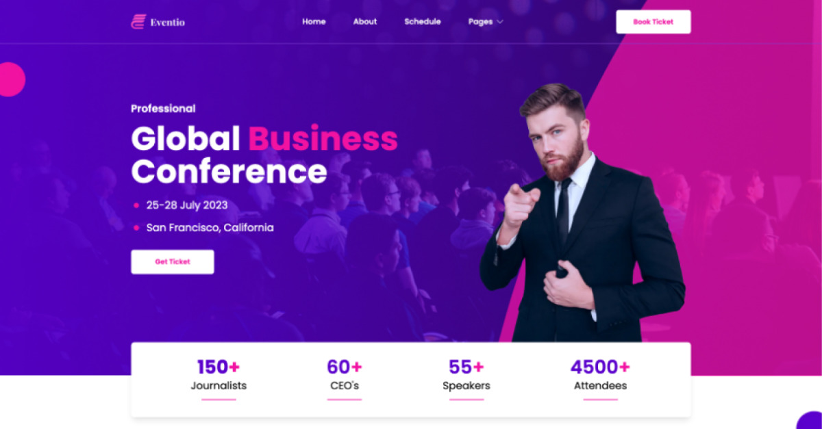 Завдяки чіткому та адаптивному дизайну цей шаблон легко використовувати на будь-якому пристрої. Він має приголомшливу цільову сторінку з усією важливою інформацією про подію, включаючи розклад, спікерів, місце розташування та варіанти продажу квитків. Шаблон також містить спеціальну сторінку для спікерів і спонсорів, а також контактну форму для учасників, щоб зв’язатися з організаторами заходу.