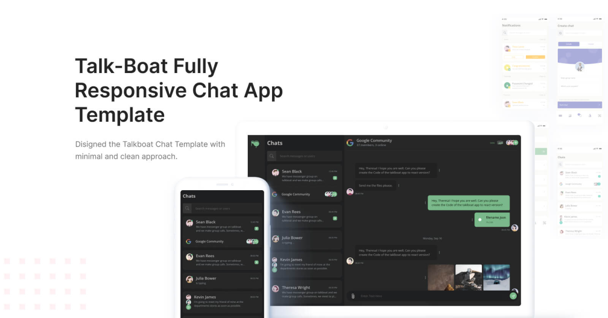 TalkBot — це простий у використанні шаблон програми для чату Html & React. Усі базові додатки Talk-Bot створено для надання кінцевим користувачам персоналізованого досвіду, дозволяючи їм вибирати тему, яка їм подобається, а також динамічні кольори для різних елементів. Вперше ознайомтеся з багатофункціональними шаблонами з інтеграцією технологій та низкою інших переваг.