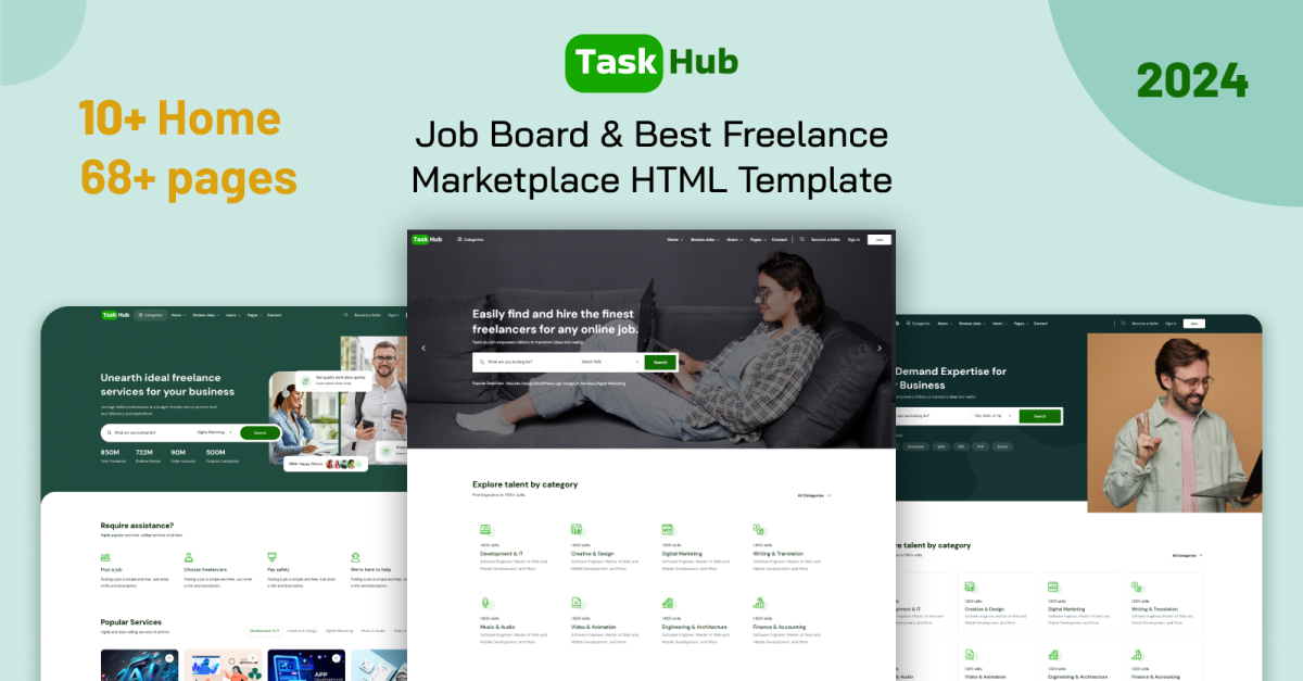 Чи готові ви вдосконалити свою платформу фрілансу? Далі не шукай! HTML-шаблон TaskHub ретельно розроблено, щоб надати вам привабливу платформу з пріоритетом для користувача, де фрілансери та клієнти можуть легко об’єднуватися та співпрацювати. Він створений спеціально для тих, хто прагне створити ринки фрілансерів і дошки вакансій, схожі на таких гігантів галузі, як Fiverr, Freelance, PeoplePerHour або Upwork.