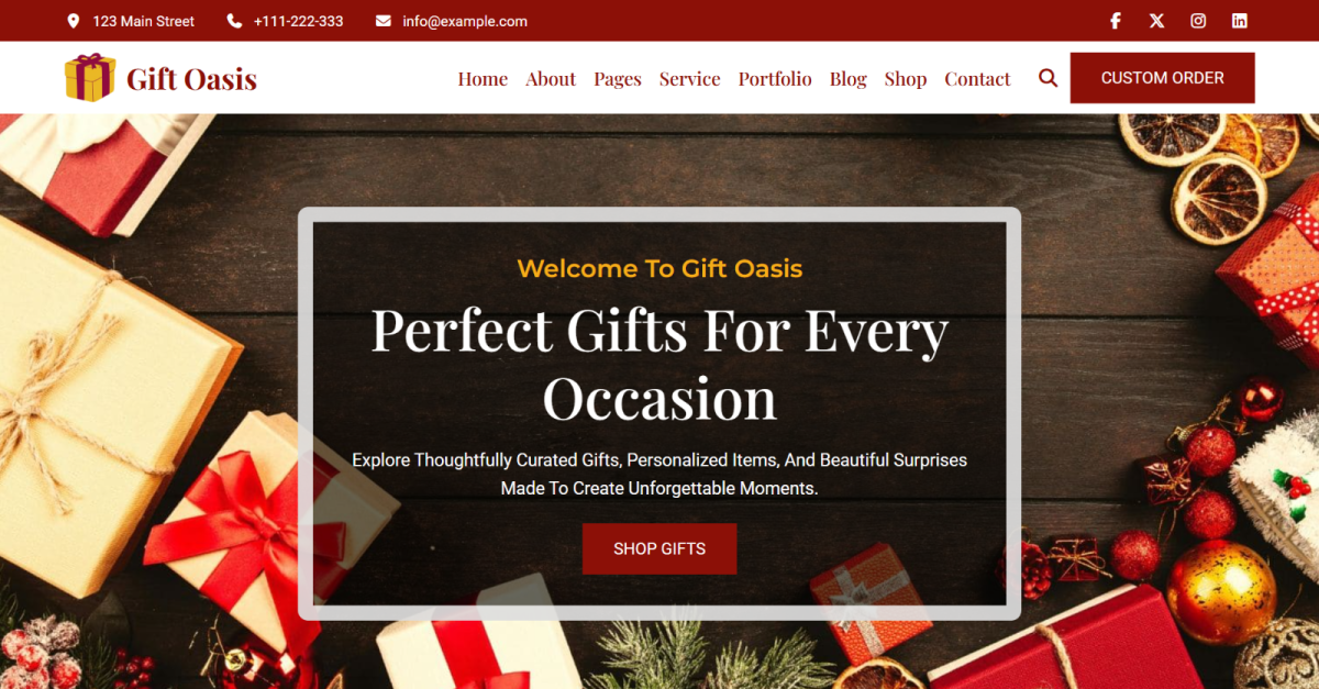 Шаблон веб-сайту Gift Oasis – Gift Shop HTML5 – це сучасний, продуманий та візуально привабливий дизайн, створений спеціально для сувенірних магазинів, магазинів персоналізованих подарунків, сувенірних бутиків, брендів стилю життя та святкових компаній, які хочуть забезпечити змістовний досвід подарунків. Розроблений з використанням HTML5, CSS3 та JavaScript , він пропонує повністю адаптивний, плавний та зручний інтерфейс , який чудово працює на всіх пристроях.