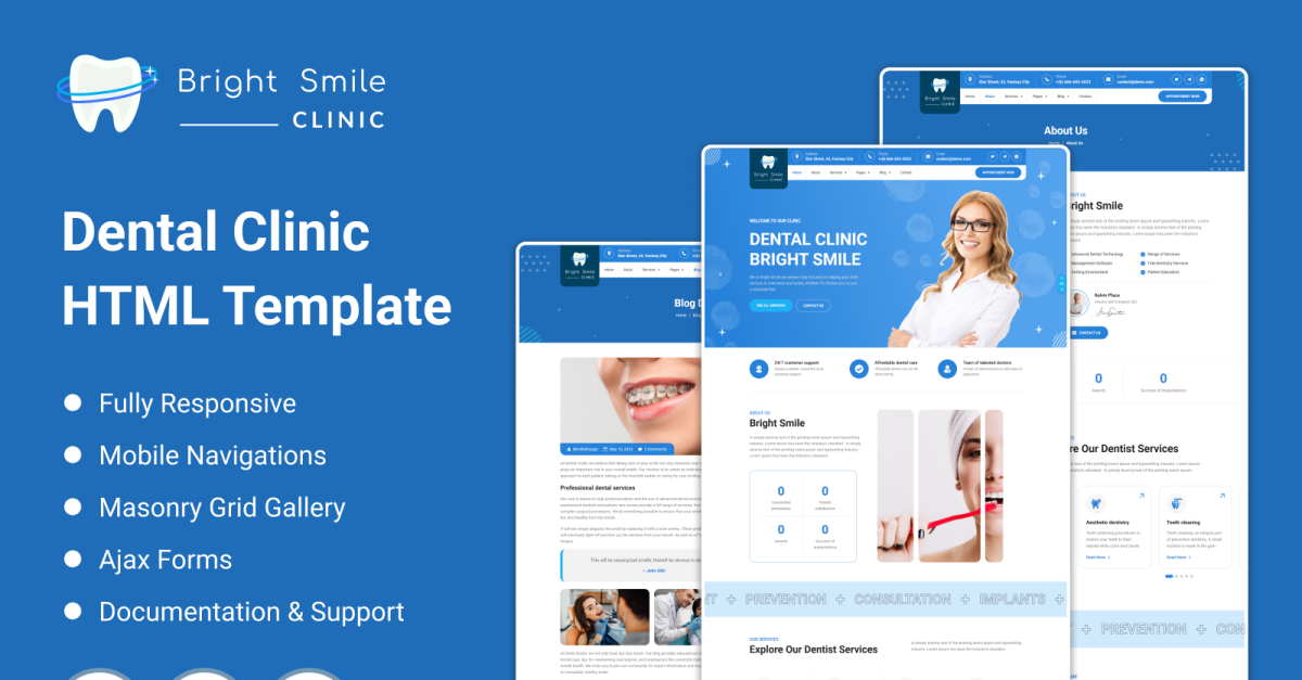 Brightsmile — це стильний і сучасний HTML-шаблон, розроблений спеціально для стоматологічних послуг. Ідеально підходить для стоматологічних клінік, ортодонтів і постачальників стоматологічних послуг, цей шаблон пропонує комплексне рішення для створення професійної присутності в Інтернеті. Шаблон містить різноманітні функції, спрямовані на покращення взаємодії з пацієнтом і спрощення роботи медичних працівників. Ці функції включають адаптивний дизайн, який забезпечує бездоганне відображення на будь-якому пристрої, інтеграцію з системами онлайн-бронювання та планування, а також численні готові сторінки та блоки, які можна легко налаштувати відповідно до конкретних потреб клініки.