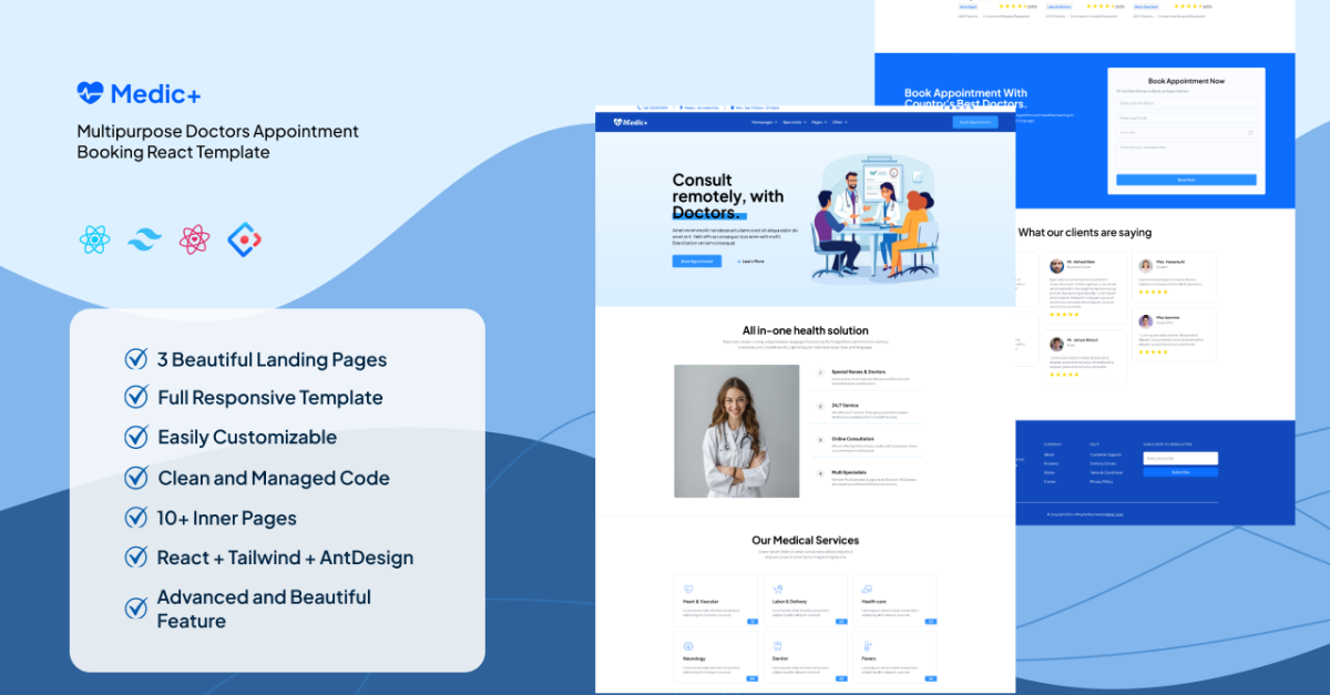 Наш Medic+ є ідеальним рішенням для лікарів, клінік, лікарень та інших медичних працівників, яким потрібен сучасний, чистий і адаптивний веб-сайт для запису на прийом. Ця тема Medic+ розроблена ретельно, пропонує інтуїтивно зрозумілий інтерфейс і потужні функції, які допомагають постачальникам медичних послуг спілкуватися з пацієнтами та ефективно керувати своїми послугами. Medic+ створено з використанням ReactJS, Tailwind CSS, Ant Design та інших сторонніх бібліотек.