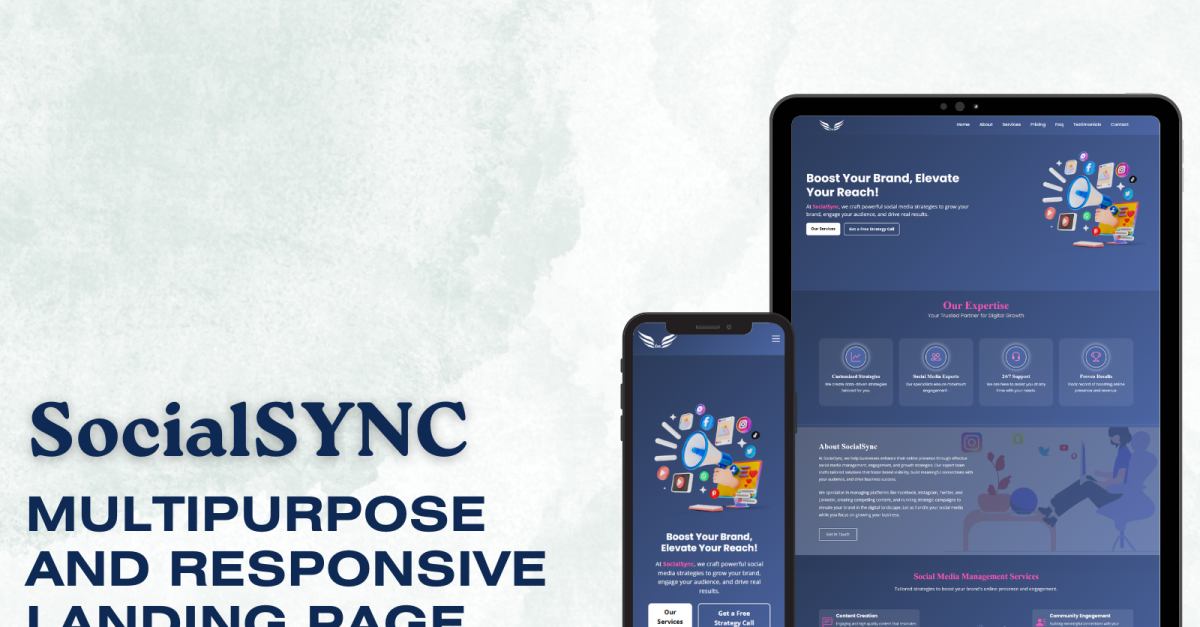 Переконливий, добре розроблений веб-сайт є важливим для будь-якого бізнесу з управління соціальними мережами, який прагне процвітати в сучасному конкурентному середовищі. Шаблон SOCIALSYNC пропонує сучасний, настроюваний і багатофункціональний дизайн, який підкреслює ваш досвід, незалежно від того, працюєте ви з малими місцевими підприємствами чи великими підприємствами. Це дає вам змогу ефективно демонструвати свої послуги та залучати потенційних клієнтів.
